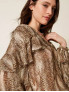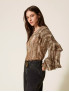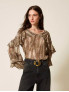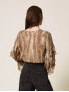 Опис: Широка блуза від TWINSET виконана з легкого крепонового матеріалу з анімалістичним принтом у відтінках коричневого з люрексом. Має багатошарові волани, довгі рукави, вільний крій. Виріб виготовлений в Італії. Лінія крою — широка (wide fit).