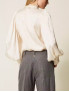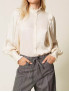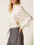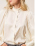 Опис: Елегантна рубашка від TWINSET виконана з жакардового атласного матеріалу з квітковим малюнком. Має високу горловину, завершену рюшами, застібку на ґудзики в тон, довгі рукави з приспущеними плечами та широкі манжети з рюшами. Логотип «Oval T» розміщений на спині. Кроїться вільно (loose fit).