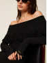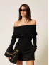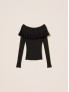 Опис: Джемпер з лінії Actitude від TWINSET, виконаний із еластичної трикотажної пряжі в рубчик із додаванням люрексу. Модель має відкритий виріз по лінії плечей у стилі bardot, оформлений широким воланом, що створює м’які фалди та додає романтичного акценту. Силует облягаючий, підкреслює фігуру, довгі рукави забезпечують комфорт у прохолодну погоду. Джемпер легко поєднується зі спідницями міді, класичними або широкими штанами, джинсами та взуттям на підборах чи пласкій підошві, створюючи як вечірні, так і стильні міські образи.