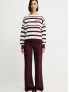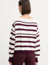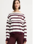 Опис: Светр з шириною і вільним кроєм, з класичним круглим вирізом горловини, довгими рукавами з опущеним плечем. Фактура трикотажу в горизонтальні білі і чорні смужки з логотипом бренду, вишитим на грудях коралового кольору. Ребристі манжети і низ для захисту від холоду. Підходить для комфортного повсякденного носіння, стиль casual. Розмір S, зріст моделі близько 175-178 см. Рекомендовано ручне прання.