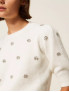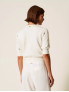 Опис: Светр з круглым вирізом і короткими рукавами від TWINSET, виконаний у м’якій ангоро-суміші з гладкою в’язкою та декоративними аплікаціями-фактурами у вигляді квітів з металевих заклепок. Лінія силуету — м’яка (loose fit), на спинці — пластинка-логотип Oval T, оздоблена нитками. Модель чудово поєднується з вузькими джинсами або спідницею-олівець для стильного міського образу.