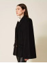 Опис: Елегантне пальто капе чорного кольору з м’якої та щільної вовняної тканини з поліамідом. Модель має подвійний ряд гудзиків із золотистими металевими деталями, комір і лацкани з оздобленням у вигляді торчон (вишуканий декоративний плетіння). Вільний крій забезпечує комфорт і свободу рухів. Виготовлено в Італії з особливою увагою до деталей, підкреслює класичний стиль і модерний шарм.