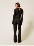 Опис: Стильні брюки з трикотажу з подвійною двокольоровою структурою і вирізами на зовнішній частині штанин, що створюють透гу. Висока еластична талія забезпечує комфорт і ідеальну посадку. Модель має розкльошені штани і прикрашена овальною нашивкою логотипу T на талії. Ідеальний варіант для сучасного гардеробу, створює витончений і модний образ.