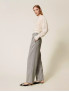 Опис: Брюки класичного крою з високою талією, прямими широкими штанинами, із сірою основою та тонкими білими смужками. Модель оснащена застібкою на блискавку з ґудзиками та бічними кишенями. Має елегантний, суворий вигляд, підходить для офісного стилю і холодного сезону. Виготовлені в Італії. Рекомендований делікатний догляд, без прання в машині, суха чистка.