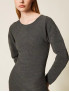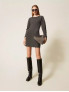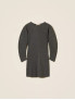 Опис: Еластичне трикотажне плаття середнього сірого кольору з приталеним силуетом. Має круглий виріз горловини, широкі довгі рукави і діагональний рельєфний візерунок, що підкреслює форму тіла. Виріб ідеально підходить для повсякденного та святкового образу сезону осінь-зима 2025/26. Довжина міні, бренд логотип розміщений на спині.