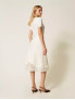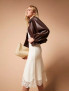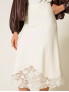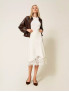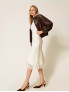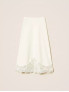 Опис: Спідниця білого кольору зі злегка розкльошеним кроєм, довжиною міді. Модель виготовлена з еластичного трикотажу з високим вмістом віскози, доповнена вставками з органзи та декоративним мереживом по низу. Має еластичний пояс для комфортної посадки. Ідеальний варіант для стильних образів сезону осінь-зима 2025/26.