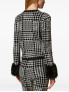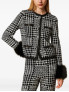 Опис: Жакет-кардиган від TWINSET виконаний з в’язаної тканини з жакардовим рисунком у стилі «чек» і «п’є-де-пуль». Модель має круглий виріз, застібку на ґудзики з логотипом Oval T, довгі рукави знімними манжетами з еко-хутра та декоративну відстрочку пайєтками по краю. Силует — вільний (loose fit), модель у кольорі Snow White/Black. Ідеально підходить для елегантних міських образів.